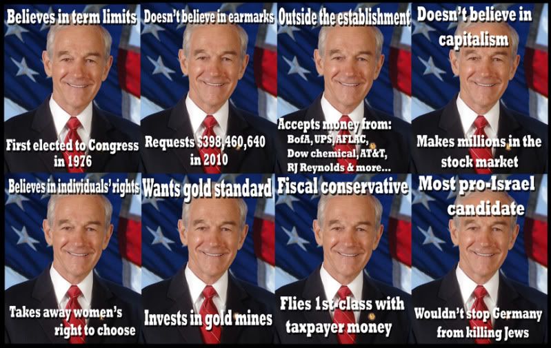 Wrong, wants everything earmarked. He accepts money from anyone. So? He believes in capitalism, not corporatism. Believes in individual rights and believes a fetish is an individual. People who don't want the gold standard invest in gold mines. Flies first class and yet gives back part of his congressional budget back to the treasury. Even this communist realizes how stupid that claim is: