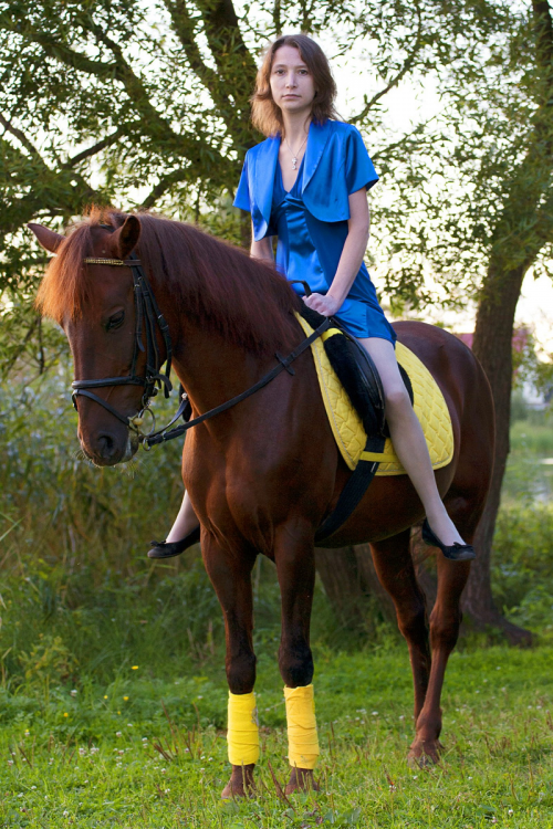 I like that the bandages match the saddle pad, but where are the stirrups? Plus those shoes don't have a heel, so riding in them would be kinda dangerous. She should really learn how to hold the reins properly.