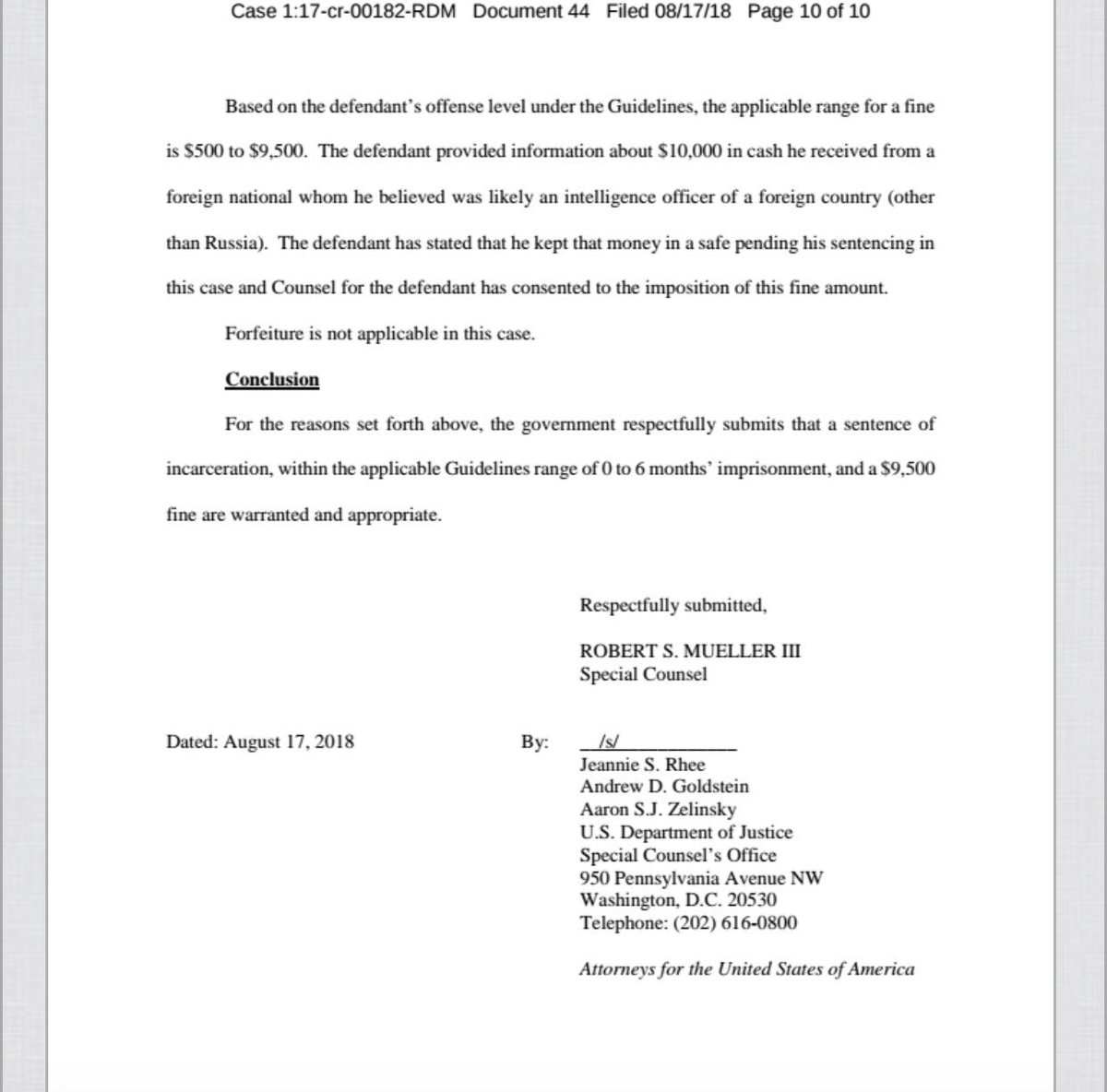 To pay his fine? Sounds like hush/payoff/collusion money to me.. Why doesn't Mueller get more specific about this large sum of cash by a "foreign intelligence officer" he's requesting as a suitable "fine?"