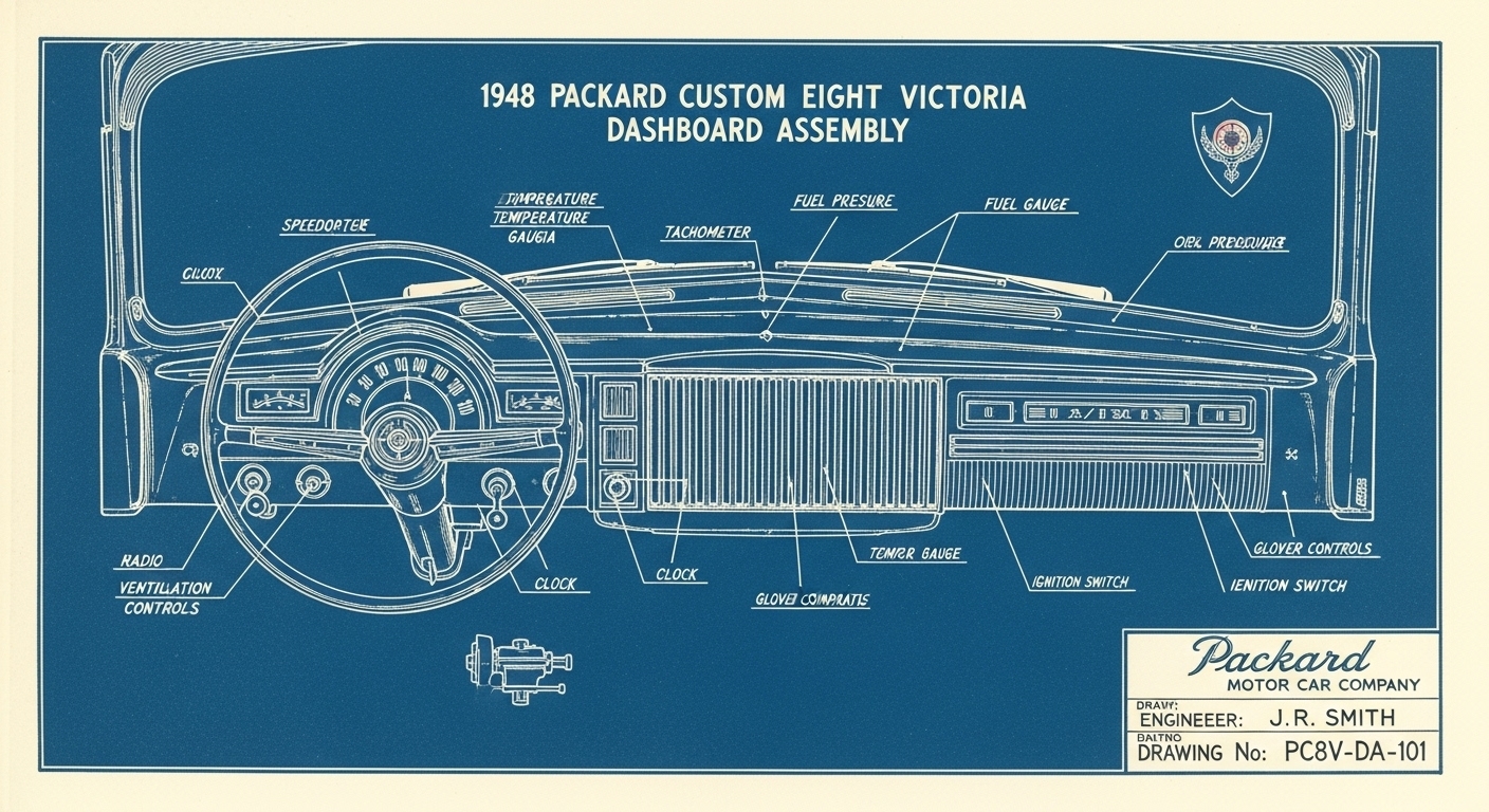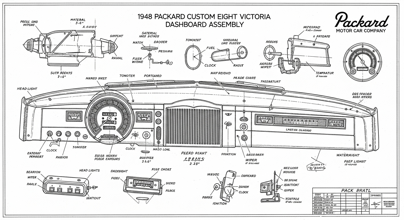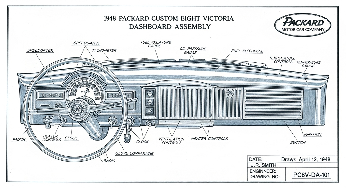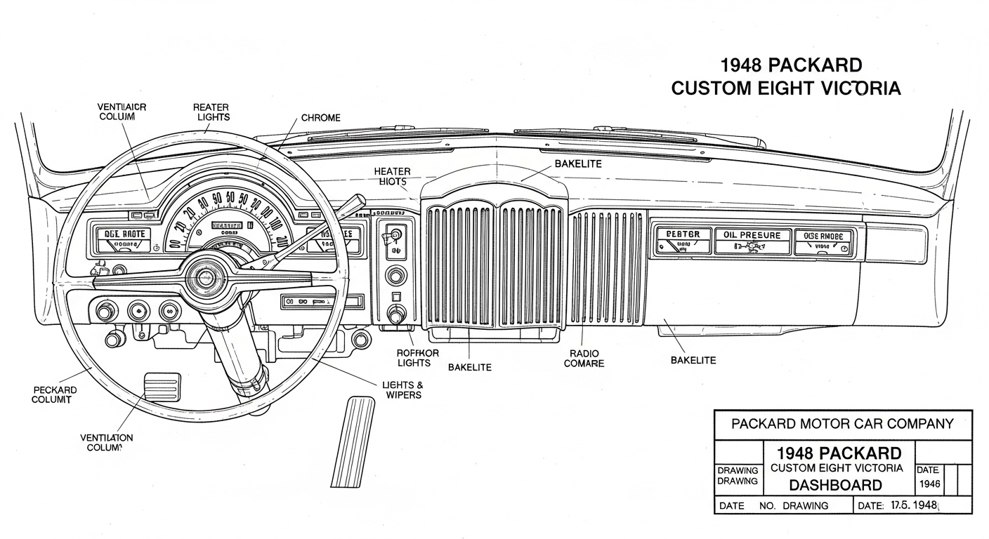 A.I. cars & engines 1948 Packard Custom Eight Victoria dashboard engineering blueprints