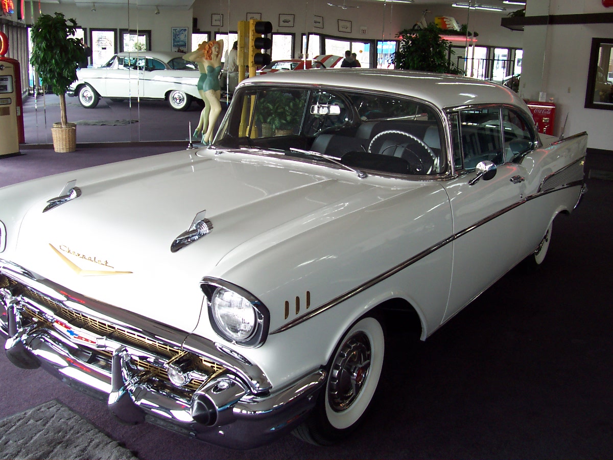This 1957 Chevrolet two door hardtop BelAir has a complete body off restoration. The restoration was done back to its original style with show quality workmanship. Has black & gray two-tone original style new interior, 283 V8 engine, 2 speed power glide transmission, wide white wall tires with spinner hub caps, a continental kit , wonder bar radio, original clock.