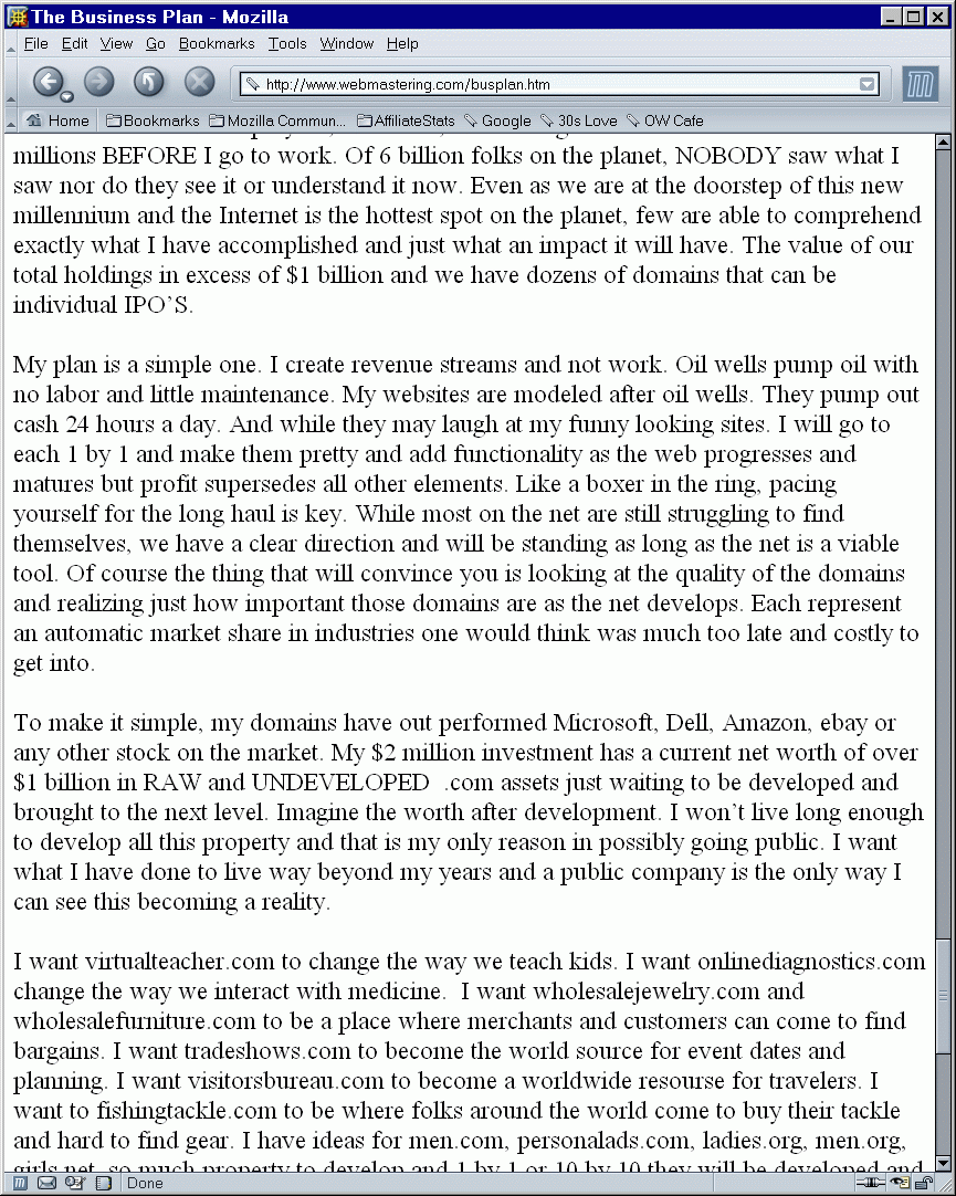 http://www.webmastering.com/busplan.htm "My $2 million investment has a current net worth of over $1 billion in RAW and UNDEVELOPED .com assets just waiting to be developed and brought to the next level." (screenshot at http://www.loffs.com/images/domainkingbillions.gif in case the original link mysteriously changes) I wonder if the ex-wife's divorce lawyer is aware of that domain portfolio valuation? $500 million would be a big payout for her, if she in entitled to half.