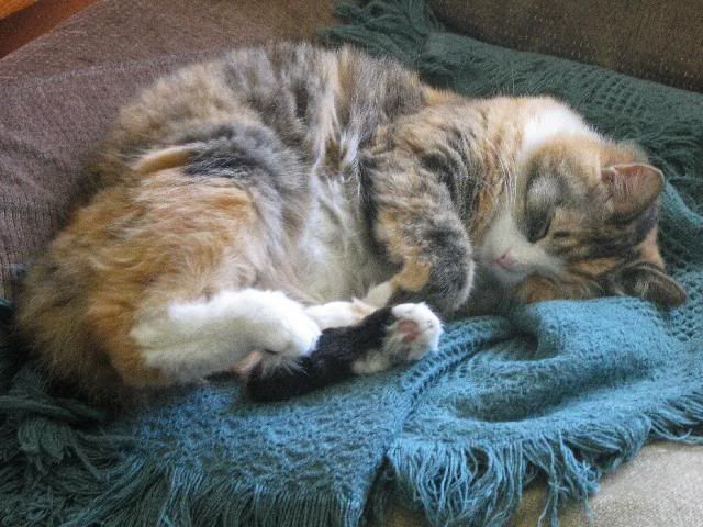Gollum was one of a litter I midwifed, and he has Down's syndrome, (which, until the vet did the test for it, I didn't realize cats could have!). As a by-product of the disease, he has a very enlarged heart and isn't supposed to be as old as he is - he was supposed to have died before age 3. He's 5 now. He's my spoiled rotten baby-san. ![]() |