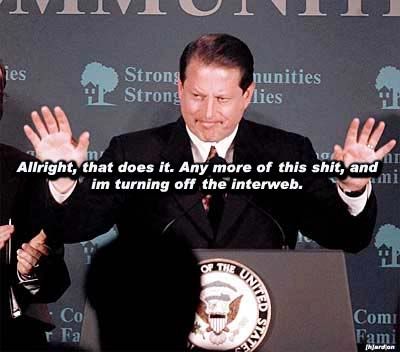 The actual quote from a 1999 appearance on Wolf Blitzer: "During my service in the United States Congress, I took the initiative in creating the Internet. I took the initiative in moving forward a whole range of initiatives that have proven to be important to our country's economic growth and environmental protection, improvements in our educational system." How the Republicans spun it: "That crackpot Al Gore is now claiming to have invented the internet!" Every time you repeat it, you are doing work for the Repukes. Gore/Hillary in 2008 |