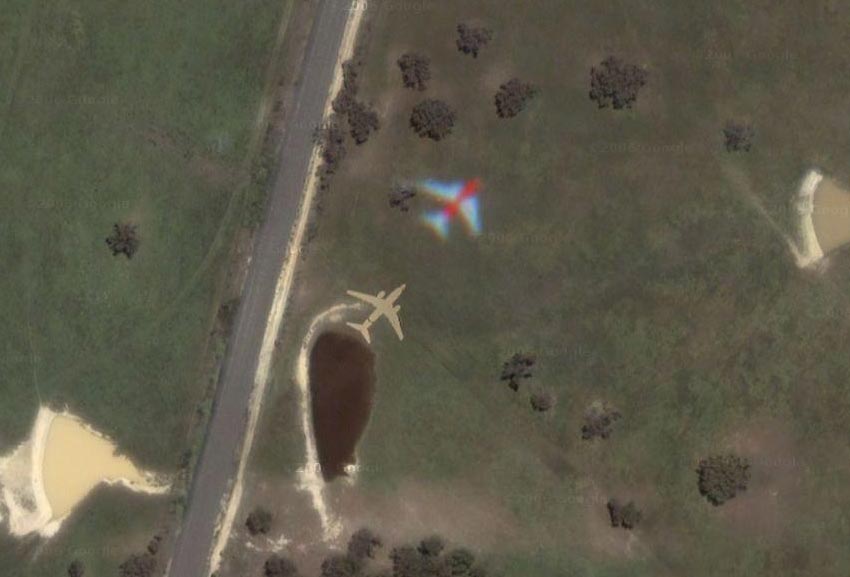 I've seen aircraft shadows before (really artifacts due to movement), but never one like this, with one part sharp and the other blurred. The aircraft size also looks out of proportion to the objects on the ground. Freaky!