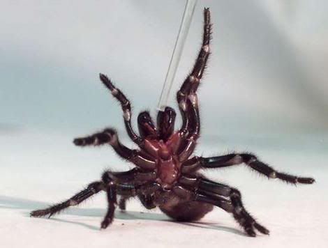 ![]() ![]() "Funnel-webs are probably one of the three most dangerous spiders in the world and are regarded by some to be the most dangerous.[1] Examination of bite records seems to indicate that wandering males have caused a large majority of fatal bites to humans, however this has not been proven. Males, recognised by the modified terminal segment of the palp, are aggressive and tend to wander during the warmer months of the year looking for receptive females of their kind for mating.[2] They are attracted to water and hence are often found in swimming pools where they have fallen while wandering. They also show up in garages and yards in suburban Sydney. While some very venomous spiders may give dry bites, these spiders do so much less frequently. It appears that approximately 10% to 25% of bites will produce toxicity[1] but the likelihood cannot be predicted and all should be treated as potentially life-threatening. There have been 26 recorded deaths in Australia in the last 100 years from spider bites. Bites from funnel web spiders have caused 13 deaths (seven in children)[1]. In all cases where the sex of the biting spider could be determined, it was found to be the male of the species.[3] Most victims were young, ill or infirm. Members of the genus Hadronyche may also cause fatal envenomations although none have been recorded. Assays of venom from several Hadronyche species have shown it to be similar to Atrax venom." http://en.wikipedia.org/wiki/Austral...nel-web_spider |
