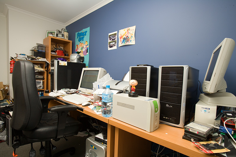 ![]() Built the desk myself this past summer. Next step is to add a 3rd monitor between the two 17"ers (turned vertical).