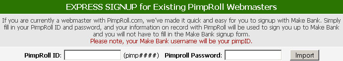 Current PIMPROLL webmasters need only enter their pimpID and password to start promoting MakeBank sites, as your information (on file with PR) will transfer automatically to MB, precluding you from having to fill out another signup form.