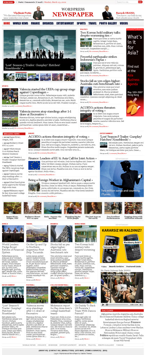 I bought "fresh news" from www.woothemes.com and love it, very quality theme. But they also have some awesome free ones available now. Using their classic news theme on a few blogs now too. That being said, I've noticed that CTR is generally lower on those "CNN style" themes...seems surfers get a little cluttered. Similar, similar traffic, similar ads, and CTR is statistically lower than on a more conventional blog theme, with 1 sidebar and a bunch of posts on top of each other. Could just be coincidence though, dunno.