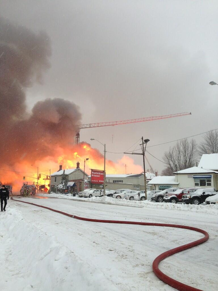 Huge fire in Kingston at a construction site for a new student housing building, this guy working a crane has crawled out of the cab and he's crawled out to the end of the arm of the crane, waiting to be rescued.