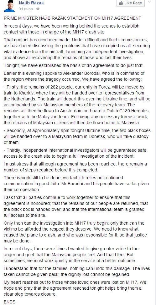 Malaysian PM Najib Razak's statement. Looks like he does not trust in the Ukr. gov. and personally made deal with Borodai (rebel leader).