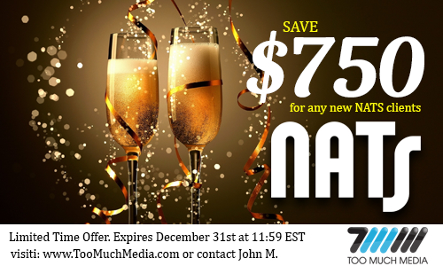 It's the end of the year and to kick off your New Year right, we here at Too Much Media decided to start your year off with BIG SAVINGS! That's right, SAVE $750 on the industry leading affiliate software NATS from now until 11:59 EST December 31st, 2015. In order to take advantage of this offer please reach out to me via my contact information below and we will get you started. If you are not familiar with what NATS can do for you, now may be a good time to schedule a demo and take advantage of the savings before it expires. http://sales.tmmid.com/banner/MTM2Lj...jAuMTQuMC4wLjA |