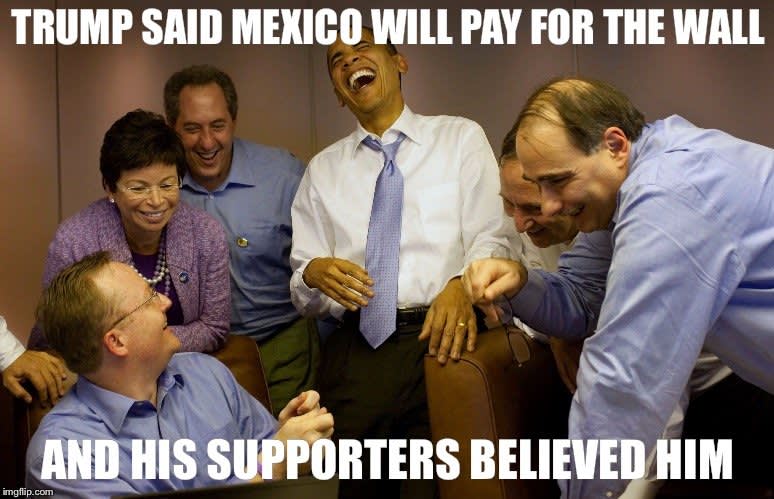 Yea Trump saying Mexico is going to pay for a wall and then changing it to Mexico will pay us back for a wall to the money it save us will pay for the wall to taxpayers will pay for a wall or I'll shut down the govt while his gullible cult followers brainlessly cheer it all makes everyone else looks crazy and irrational. :1orglaugh:1orglaugh:1orglaugh |