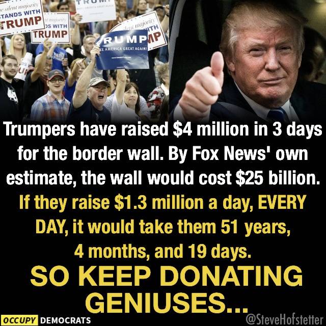Somewhere in the heartland, there are thousands of suckers in trailers who wasted their meth money on a pointless wall(which will never be built BTW) |