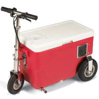http://s7ondemand1.scene7.com/is/ima.../74747?wid=200 The 14 M.P.H. Cooler This is the only ridable, three-wheeled cooler with a 500-watt electric motor that propels the unit up to 14 mph, and it has a fully insulated bin that accommodates up to 24 12-oz. beverage cans and 8 lbs. of ice, allowing you to transport chilled food or beverages up to 15 miles on a single charge. The enclosed frame is built from durable yet lightweight aircraft aluminum, and the unit has a chain drive, disc brake, and variable-throttle control, ensuring speeds and handling that are similar to a golf cart's maneuverability. A cup holder is located between the driver's knees, and it opens to allow access to beverages stored in the cooler while driving. The handlebars have a throttle and a brake lever for confident stops, starts, and accele ration, while the pneumatic tires provide traction on gravel, pavement, or lawns. The handlebars and foot rests remove for transport in the trunk of a car. Includes rechargeable battery and AC adapter. Supports up to 300 lbs. |
